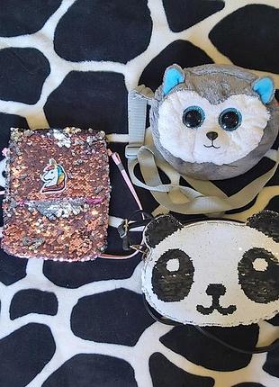 Новые яркие, удобные, модные сумочки для девочек. Ручки у всех регулируются набор плюшевый котик 18×18+кошелек, пандочка в пайетках перевертышах 20×15 см-300 грн розовая пони в пайетках -200 грн панда в пайетках перевертышах 21×17 см- 300 грн