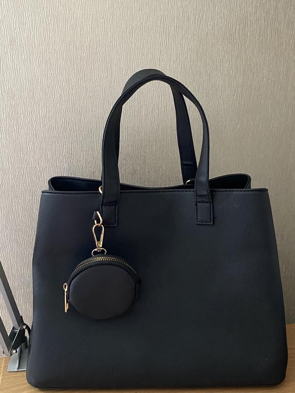 Сумочка чорного кольору, вживана кілька разів. Купувалася близько за 1000. В гарному стані, без дефектів. Матеріал: еко шкіра. Йде з вшитим коротким ремінцем та з додатковим довгим ремінцем(можна носити через плече). В комплекті є маленький гаманець/аксесуар(фото 1). Можна вмістити формат а4 Три відділення, одне з яких з застібкою , інші на магнітних кнопках. Всередині відділень ще кілька маленьких карманів. Підійде для навчання/ роботи. Заміри: Ширина знизу 34 см Ширина зверху 30 см Висота 26 см Ширина дна 14 см