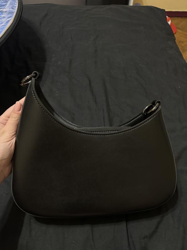 Сумка, черная, асимметричка В середине имеет 2 кармана, один с которым на взлете Имеет карабины для ремешка, самого ремешка нажаль нет(