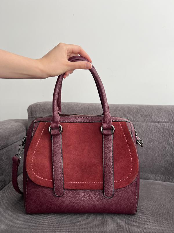 Жіноча сумка на кожен день в трендовому кольорі бургунді зі замшовою вставкою. Підставка з багатьма відділами. Є додаткова довга ручка (88 см) Розмір: 27х27х12 Стан: ідеальний, лише один кутих (видно на фото) затертий