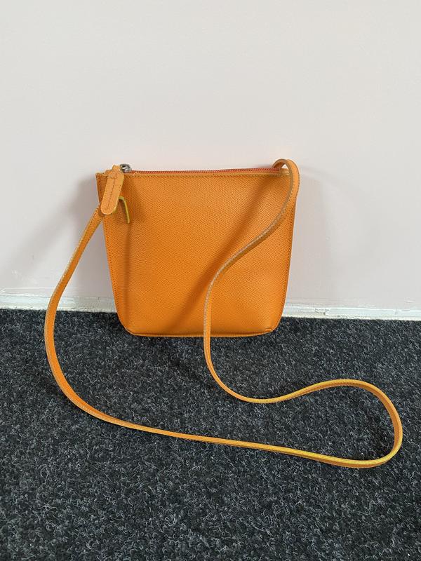 Оранжевая сумка из натуральной кожи, 20,5х21см, ручка 111см, не регулируется. Внутри нет отдельных карманов. Ношена нечасто, в хорошем состоянии. .