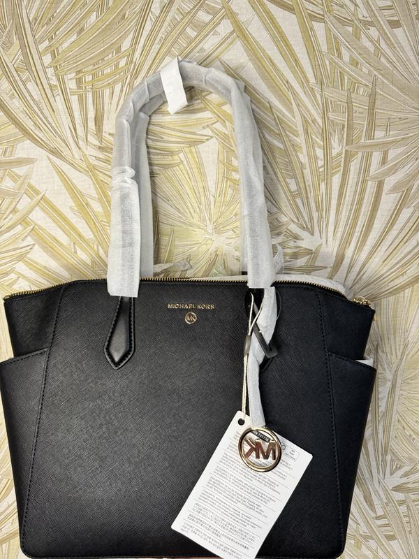 Продам нову фірмову сумку Michael Kors з натуральної шкіри - saffiano. Сумка має жорстку форму, має 1 великий відділ та закривається на блискавку, оздоблена золотим металом. Розміри: 29.5/38 x 26 x 12 cm, в комплекті також пилозахистна торбинка. Висота ручок: 24 cm Кількість кишень на блискавці: 1 Кількість плоских кишень: 4 Ціна на сайті близько 12 тисяч.