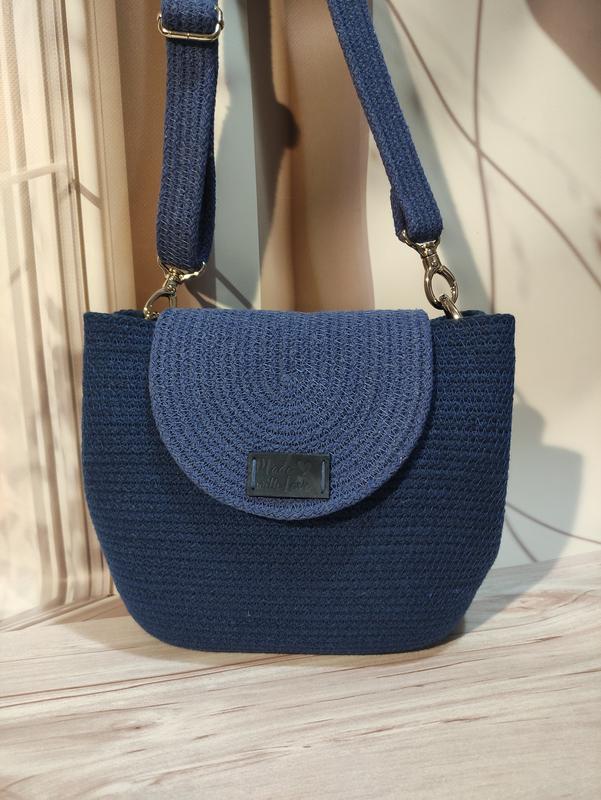 Сумочка изготовлена из хлопкового шнура, имеет одно общее отделение. Внутри карман на молнии. Размер 21x18x10 см. Под заказ.