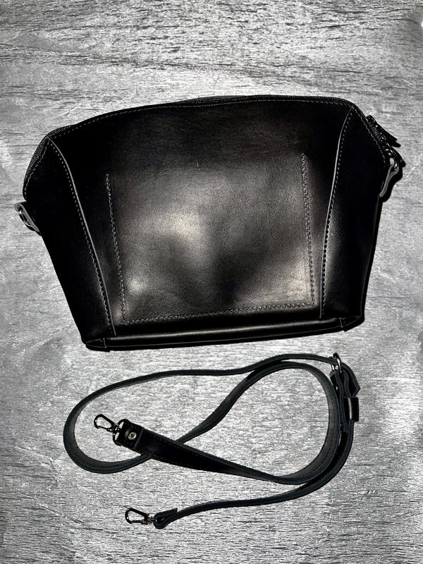 Сумка из натуральной кожи. Новая ! Длина низа 23 см( в самом узком месте) Высота 21 см. Длина ремня 116 см.