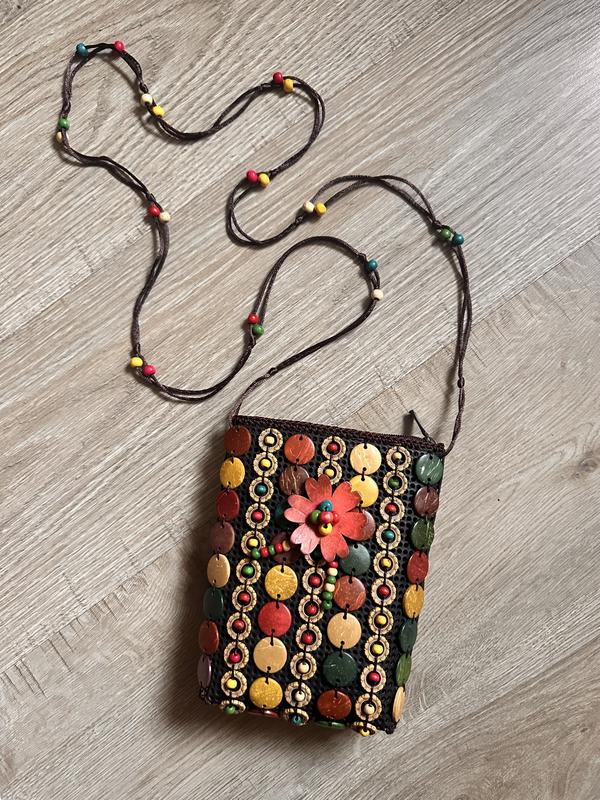 Украшена деревянными бусинами,довольно жесткая,держит форму,на подкладке,на молнии
