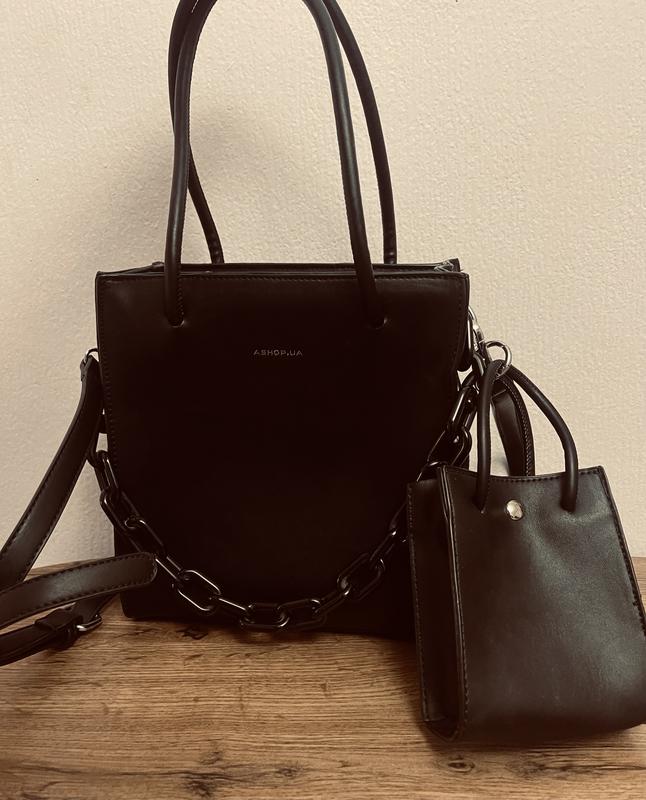 Черная сумка среднего размера из экокожи с декоративной цепью. Имеется регулируемый ремень, снимаемый и дополнительная маленькая съемная сумочка. Стан идеальный (благодаря пару раз)