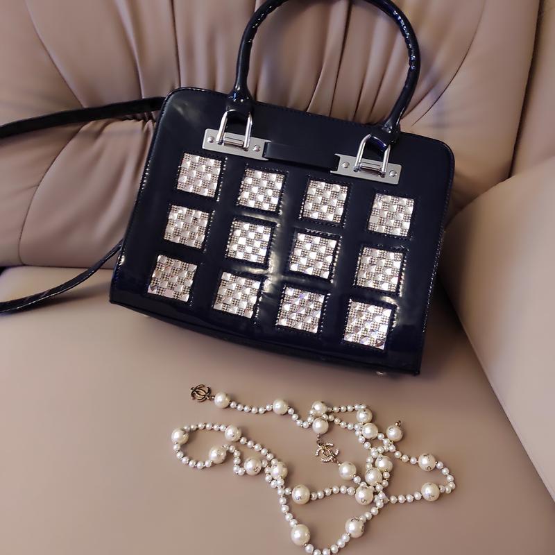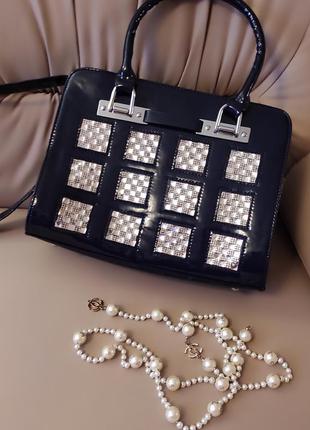 Нова, темно- синя лакована сумочка, надзвичайний ошатний стиль, візерунок з кристалів на лакованому фоні не залишить нікого байдужим, якісна штучна шкіра, акуратне пошиття, сумка стильна і святкова, всередині два відділеня і чотири кишеньки; довжина*висота=31*24 дно=32*10