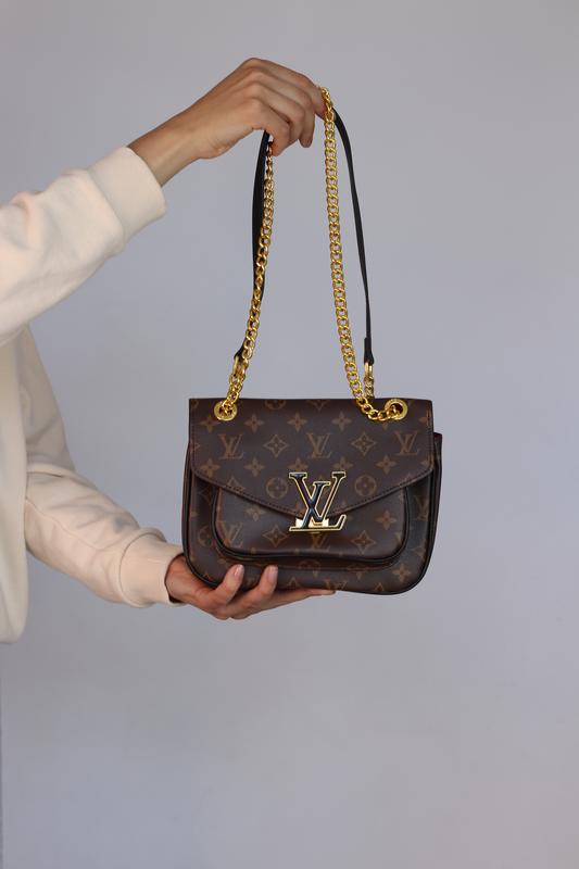 Passy 📌Арт: 0420: 🔗 Размер: 22х19х11 🔗 Материал: Эко кожа Сумка изготовлена из эко кожи с принтом логотипа, имеет одно основное отделение и спереди дополнительный карман для самого необходимого. В основном отделении есть кармашек на молнии. Плечевой ремень - цепочка со вставкой из эко кожи, которую можно носить извлеченным на всю длину через плечо или составленным в два раза. Фурнитура золотистого цвета. Упаковка: брендовая коробка, замыватель, наполнитель.