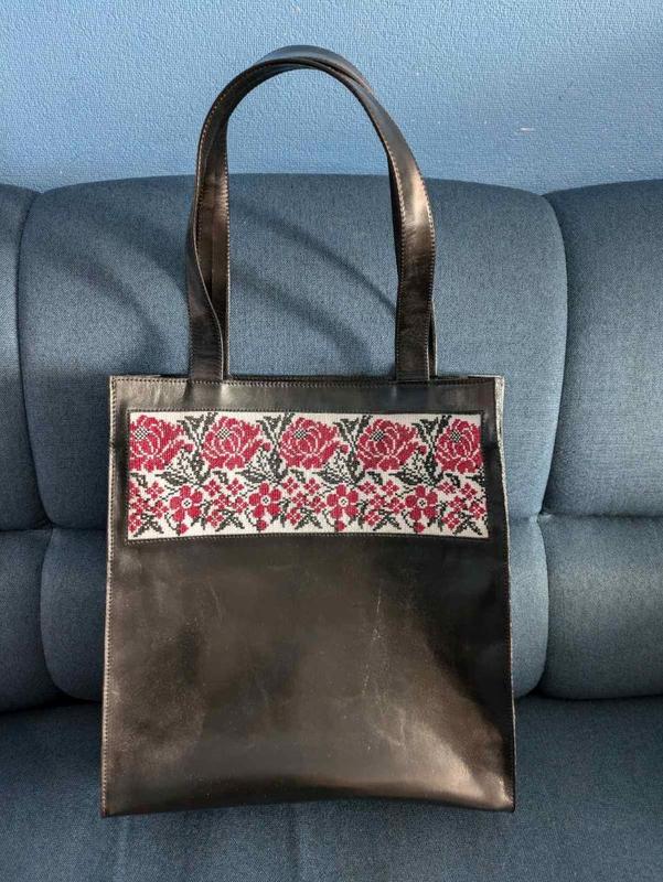 Красива шкіряна сумка для жінок з вишивкою "Півонія" (ручна вишивка хрестиком). Чорна, з двома внутрішніми карманами. Прекрасно доповнить неповторний образ, а також слугуватиме гарним подарунком для коханих. Розмір 35x37x11 см