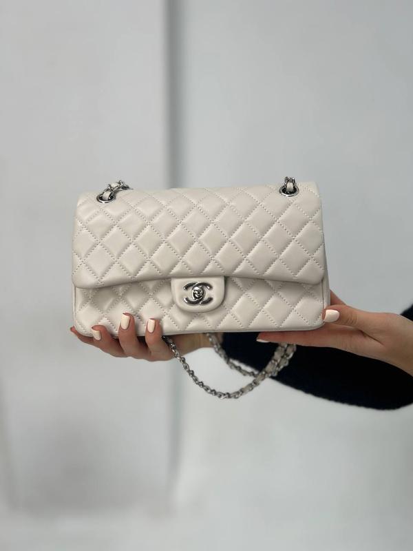📐 Размер: 25 х 16 х 6см 🧵 Материал: Кожа 🔎 Описание: Сумка выполнена из гладкой простроченной кожи. Внутри одно отделение, также есть 4 небольших кармана один из которых на застежке. Подкладка из молочной гладкой кожи.Фурнитура металлическая и брендированная. Цепочка с вплетенной кожей может регулироваться как для ношения в руке, так и для ношения через плечо. Имеет железную вставку с серийным номером. Упаковка: брендовая коробка, пыльник, буклеты.