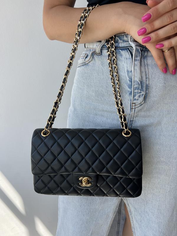 2.55 Black Gold (арт:02010) Премиум качество⭐️ 📐 Размер: 25 х 16 х 6 см 🧵 Материал: Кожа : Сумка выполнена из гладкой простроченной кожи. Внутри одно отделение, также есть 4 небольших кармана один из которых на застежке. Подкладка из бордовой гладкой кожи. Фурнитура металлическая и брендированная. Цепочка с вплетенной кожей может регулироваться как для ношения в руке, так и для ношения через плечо. 🛍Бесплатная упаковка: брендовая коробка на магнитах, пыльник, буклеты