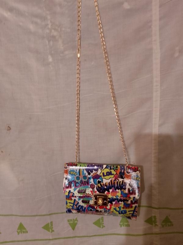 Сумка яркая и новая. Очень красивая и стильная, высота 18 см, ширина 11 см, а низ 4 см. Ручка цепочка.