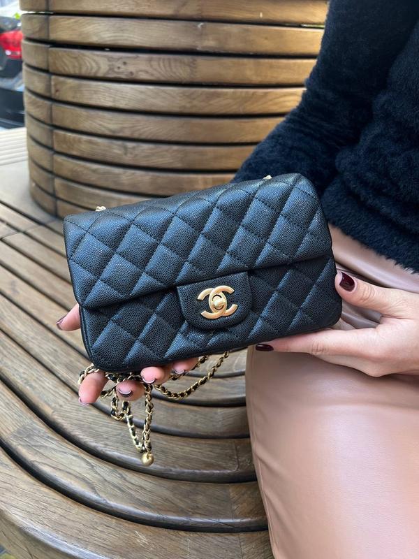 20 caviar(Арт: 02023) 📐 Розмір: 20 х 13 х 6 см 🧵 Матеріал: Шкіра 🔎 Опис: Сумка виготовлена з м’якої шкіри чорного кольору. Всередині одне основне відділення та невелика кишеня на блискавці. Підкладка зі шкіри в золотому кольорі. Фурнітура металева, з золотим покриттям, має залізну вставку з серійним номером. Сумка на ланцюжку, має вплетення з шкіри та залізний брендований замок для регулювання довжини. Брендова коробка на магнітах, пильовик, буклети