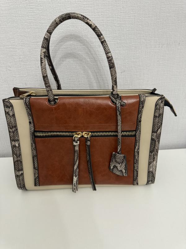 Сумка в ідеальному стані, кремовий+зміїний принт+ рижий. Розмір: ширина- 12см, висота без ручки - 23 см, с ручками - 35см, в середині один великий відділ, кишені для телефону та маленький на молніі. Зовнішній карман функціональний.