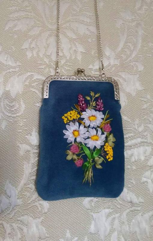 Невелика сумочка для телефону або смартфону з фермуаром. Зшита з синього велюру, оздоблена вишивкою стрічками, на підкладці, посилена дублерином. За рахунок цього добре тримає форму і надійно захищає телефон. Невелика, зручно тримати в руці, можна носити на ланцюжку. Розмір 15*20см. Стильна штучка незмінно приковує до себе здивовані і захоплені погляди!Підходить як вечірня сумочка для виходу в театр чи на прогулянку. Ніжна вишивка стрічками не залишає байдужим нікого! Незамінна і універсальна річ в наш час! Повністю авторська робота, єдиний екземпляр.