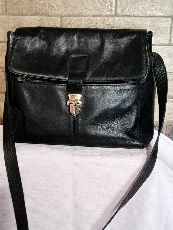 Вместительная сумка-портфель. Замеры (от шва до шва): дно 9 см, длина 29, высота 28, боковые стенки 12 см, ремешок 130, регулируется. Сумка имеет внутри два вместительных самостоятельных отдела, карман на молнии и еще два кармана наружные, один на молнии, второй - нет. Подкладка - качественный дермантин. Все целое, молнии работают.