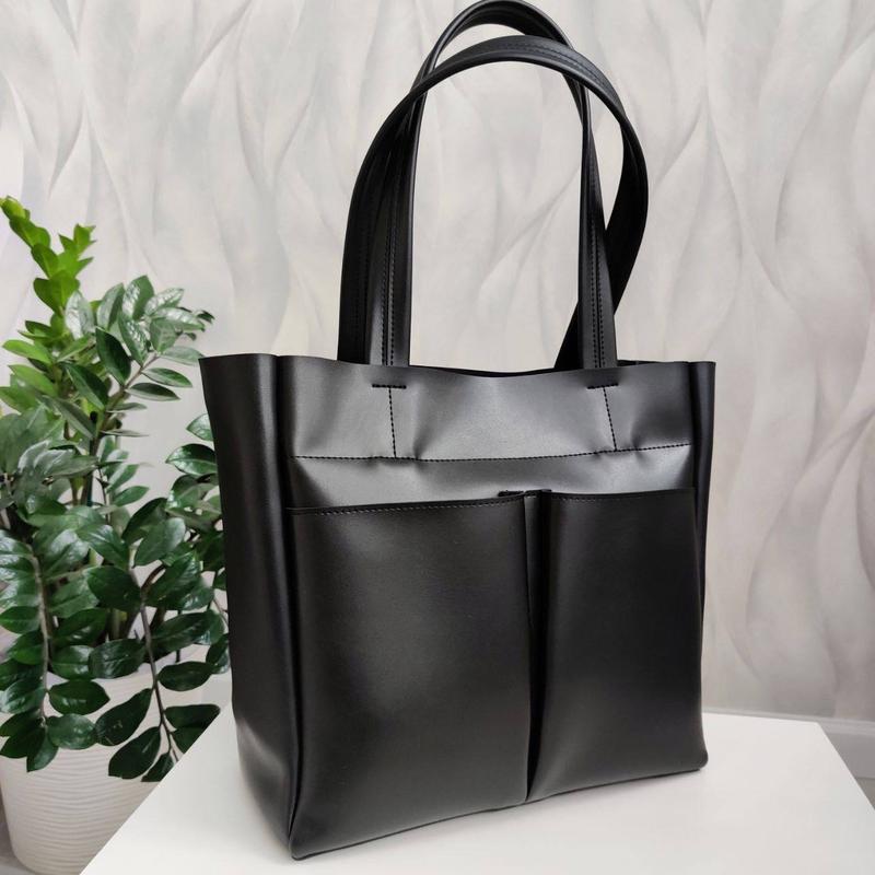 🔥Вмістка, гарна модель сумочки під формат А4 🔥📐Розмір: Висота-30 см Ширина по низу - 33 см Дно-14 см Довжина ручок - 57 см Матеріал - еко шкіра. 📌Сумка має одне відділення. Всередині дві відкриті кишені та одна на блискавці. 📌Спереду дві відкриті кишені. 📌З тильної сторони кишеня на блискавці.