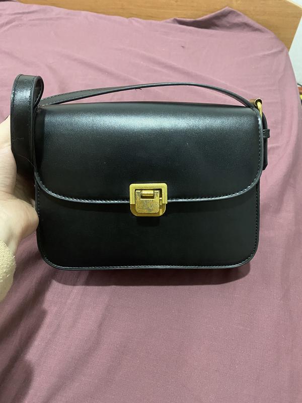 красивая сумочка черного цвета,е нюанс на сумке( на золотистой кнопочке,трешки стерлась краска) есть еще один ремешок длиннее