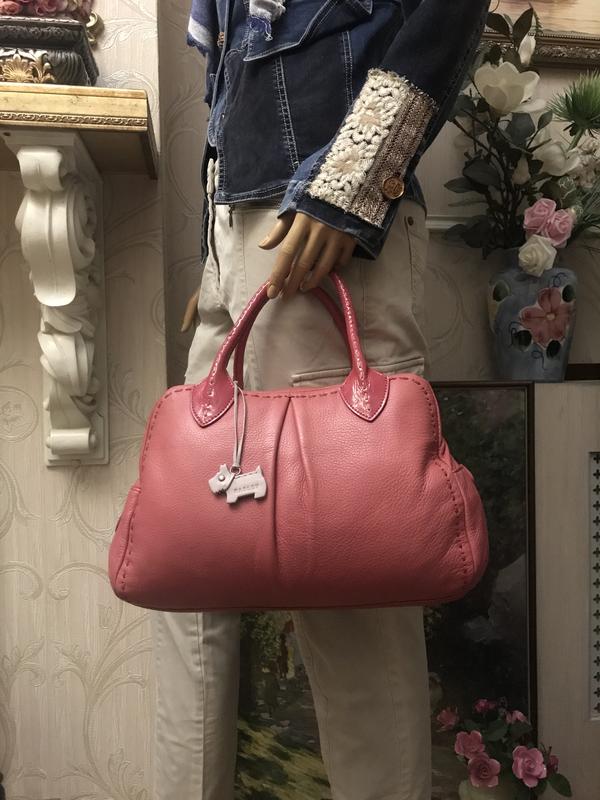 Натуральна (дуже м‘ягка шкіра). Колір рожевий. Ручки та шви з лакової шкіри. Розмір 29см/19см/11см. Стан сумки зовні без зауважень. Всередині є плями зеленого кольору (останне фото) … можливо плямовивідник прибере цей недолік. Додаткова інформація за вашим зверненням.