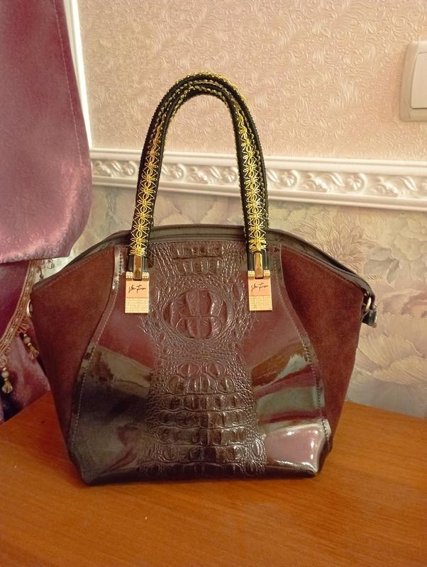 Красива сумочка коричнево-шоколадного кольору. В идеальном состоянии. Из недостатков - немного облезла кожа на дне (на фото видно). При пользовании не видно. Ширина 38см, высота 27см, ширина дна 16см. Содержимое и качественная