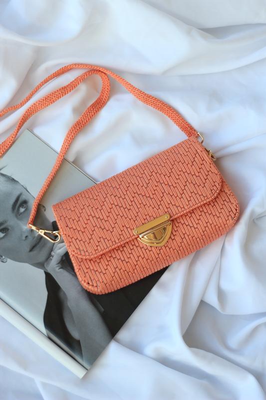 Сумка ручной работы летнего персикового цвета. Выполнена из плотной прочной турецкой пряжи, благодаря каркасу хорошо держит форму. Имеет подклад. Застегивается на золотой сумочный замок. Плечевой ремешок можно снимать и, по желанию, менять на другой.