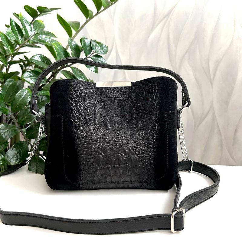 🔥Зручна, гарна, сумочка на три відділення 🔥 Матеріал -✅ Натуральна замша+ еко шкіра. 📐Розміри : Висота - 19 см Ширина - 23 см Дно - 12 см Коротка ручка, та довгий ремінець, що регулюється. Сумочка має три відділення. Основний відділ на блискавці, два інших відділи закриваються на кпопку-магніт. Всередині одна кишеня на блискавці та три відкриті кишені.