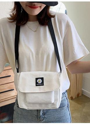 Мечтаешь создать романтичный образ? Стильная сумка Ромашка создана именно для тебя🌺 Не смотря на небольшие размеры, сумка компактная и вместит все необходимые вещи 🎈Застегивается на молнию и липучку. Модель выполнена из высококачественного материала, имеет два отделения. Прикрашена принтом Ромашка Длина ремешка регулируется. Размер: высота 18 см, ширина 24, ширина дна 6 см Материал: 100% хлопок В наличии есть белые цвета. Внутри сумки есть подкладка. Придбай Ромашку и стань неповторимой 👍