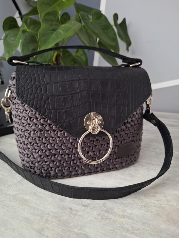 Сумка выполнена крючком из полиэфирного шнура, с использованием кожаной фурнитуры. В середине сатиновый подклад с кармашком для мелочей, застегивающийся на магнит. Размер: ш22×в18×г10