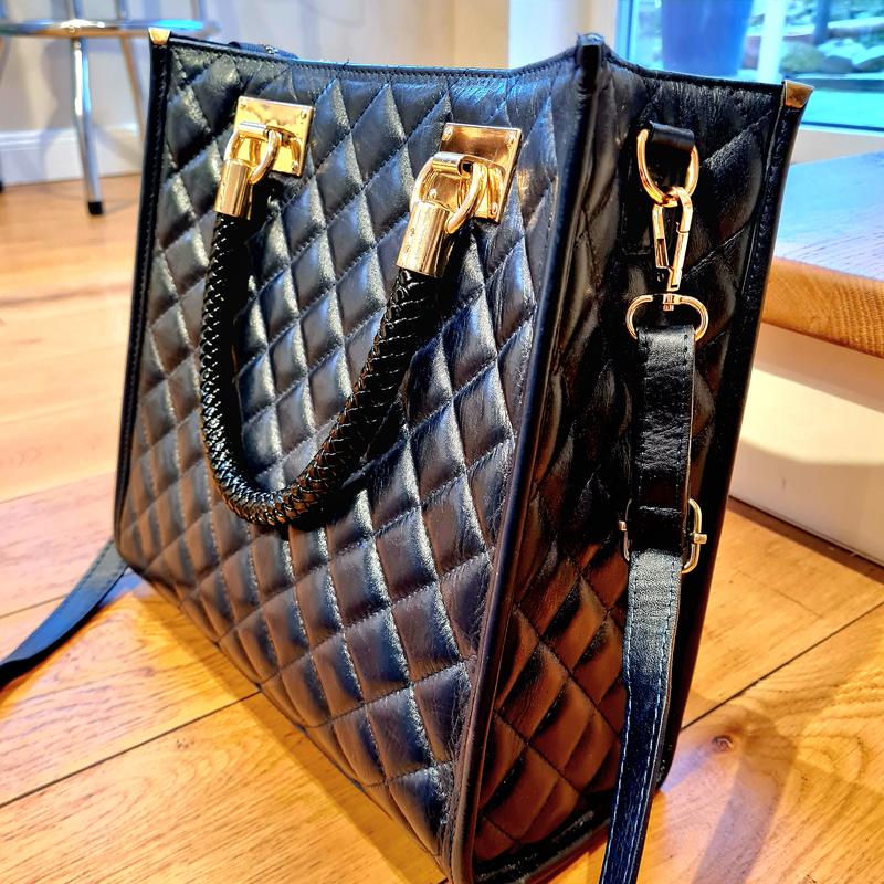 Сумка виробництва Італії. Дуже якісна, тримає форму. Темно-синього кольору. Стьогана. Розміри 27×30×10 В комплекті довгий ремінь, що відстібається. В ідеальному стані.