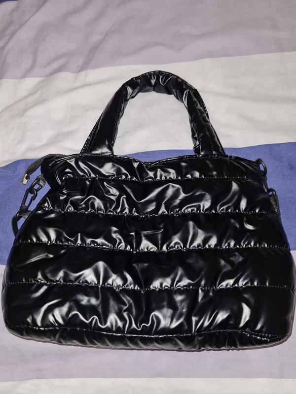 Стеганая сумка, черного цвета, содержимое, среднего размера. В середине два кармашка, но на одной не работает молния