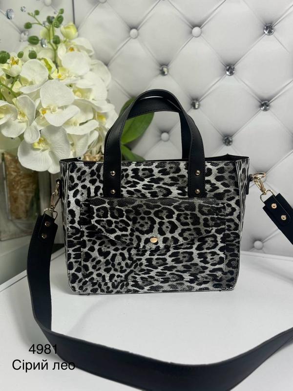Эко кожа леопардовый принт 28 см ширина. 22 см высота. 11 см глубина. Высота ручек 12 см. Высота плечиного ремня 45 см. Длина плечиного ремня 100 см с карабинами. Одно отделение на молнии. Внутри карман для телефона и карман на молнии. На лицевой стороне карман под клапаном.