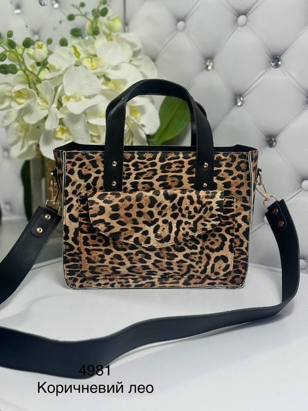 Екошкіра леопардовий принт 28 см ширина. 22 см висота. 11 см глибина. Висота ручок 12 см. Висота плічного реміня 45 см . Довжина плічного ременя 100 см з карабінами. Одне відділення на блискавці. Всередині кишеня для телефона та кишеня на блискавці. На лицевій стороні кишеня під клапаном.