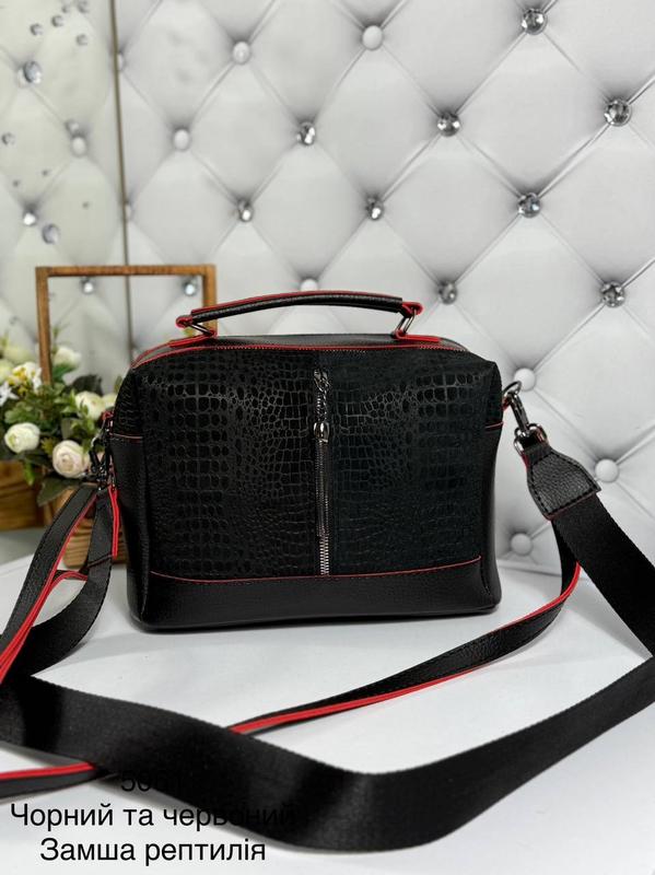 Натуральная замша РЕПТИЛИЯ и Экокожа 26x20x13 В комплекте два ремня. 135 см максимальная длина ремня регулируемого (из экокожи) 103 см длина текстильного ремня (нерегулируемого) Два отделения на молнии. Внутри карман на молнии и карман открытый. На лицевой стороне отделение на молнии. На обороте карман на молнии.