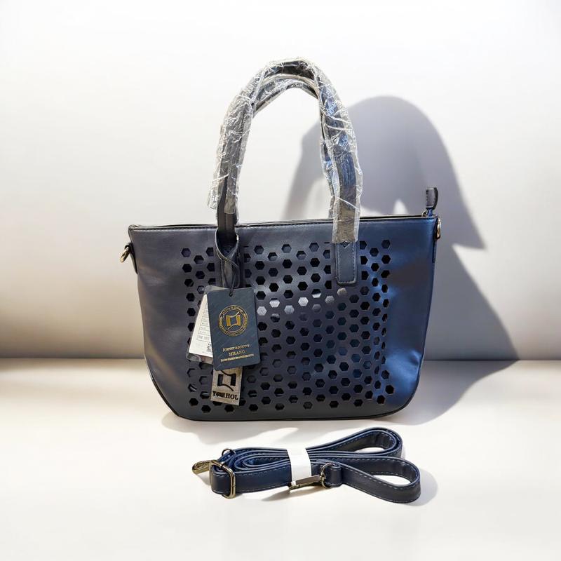 Стильная новенькая с перфорацией темно-синего цвета от бренда Johnny & Johnny Milano Плотная экокожа, держит форму Сумка на одно отделение в котором есть доп сумочка Плечевой ремень в комплекте Размер 24×36×12