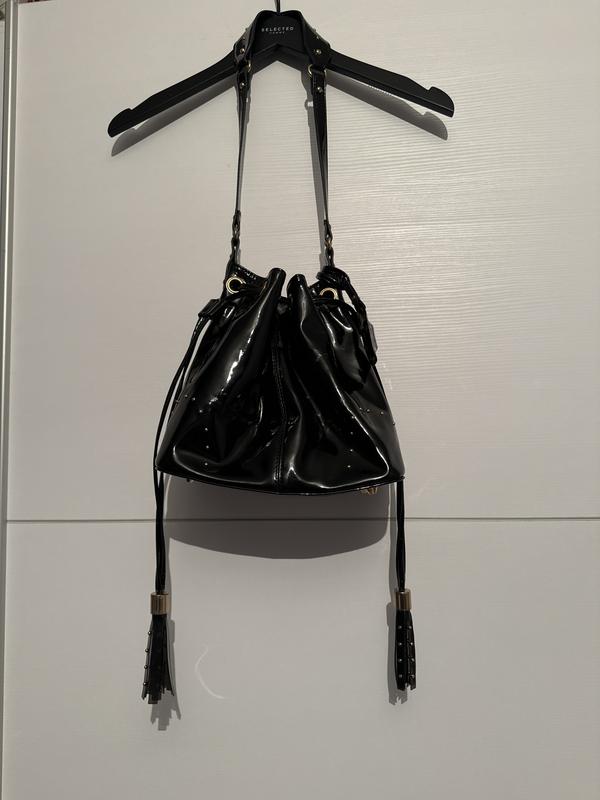 Сумка виготовлена з штучної лакової шкіри Підклад тканина Всередині ж кишеньками на замочку Стягується з обох боків Стан гарний , без дефектів Висота 25 Ширина 33 Дно Ширина 16 Довжина 26 Ручка не регулюється ( довжина 75)