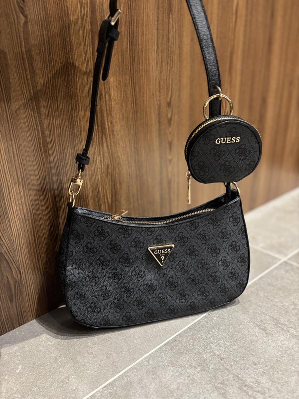 Маленька сумочка із колекції Guess. У комплекті міні-гаманець для монет. Застібається на блискавку.Ззаду кишеня для телефону на блискавці.Має внутрішні кишені та відділення для карток. Знімний регульований ремінь. У комплекті чохол. - Глибина: 6 cm. - Висота: 18 cm. - Ширина біля основи: 27 cm.