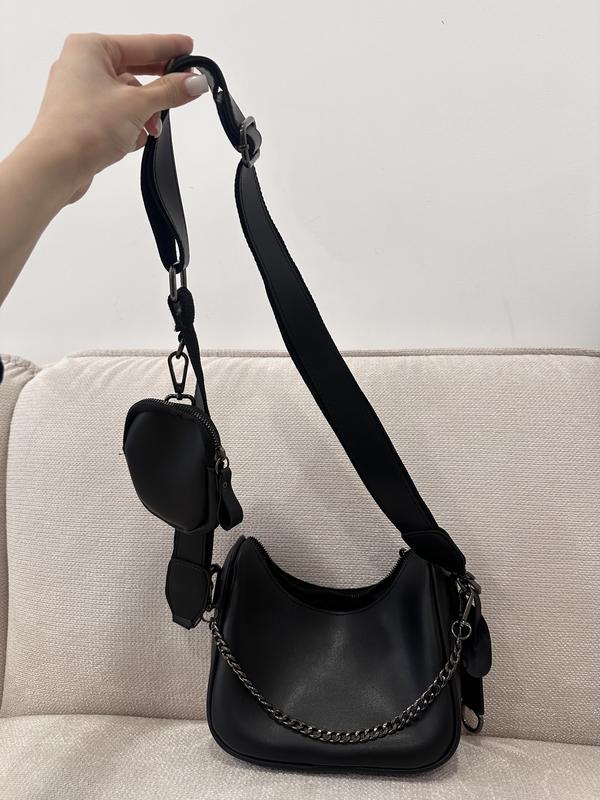 Стильная черная сумка через плечо из качественного материала. Оснащена металлической цепочкой как декоративным элементом и дополнительным карманчиком, что удобно крепится к ремню. Ремень регулируется для комфортной носки. Идеально подходит для повседневного использования и под любой образ. Стан идеален, без дефектов.