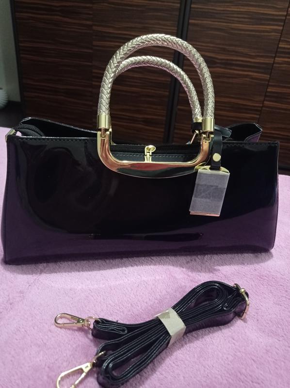 новая сумочка. цвет черный лак. отделка золотой цвет. искусственная кожа размер длина 35 см, высота 16 см, ширина 10-12 см. две короткие ручки. есть и наличия длинная с карабинами. возврат нет.