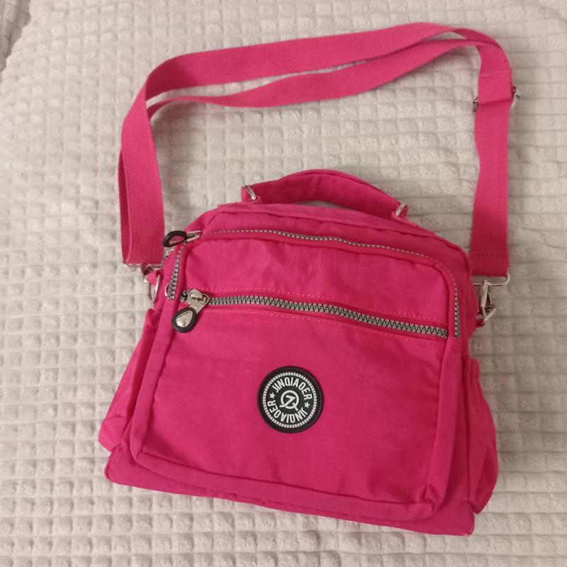 Яркая вместительная сумка бренда Jinqiaoer.. Можно носить в руке и на плече ( длинный регулируемый ремень снимается). Внутри одно большое отделение и карман на молнии. Снаружи есть еще 3 отделения на молниях, сбоку карманчики для бутилок. Качественная водонепроницаемая плащевка. 22*24*11,5. Состояние идеальное( новой).