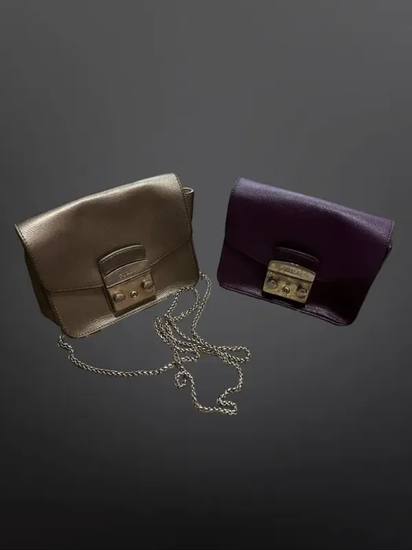 Сумки из натуральной кожи золотая фурнитура плотная застежка основной отдел, один накладной карман фирменная упаковка не включена модели сумки Метрополис Состояние красивое Детали: Ширина 17 Высота 13 Глубина 8 Длинный плечевой ремень 127 Цвет фиолетовый и золотистый