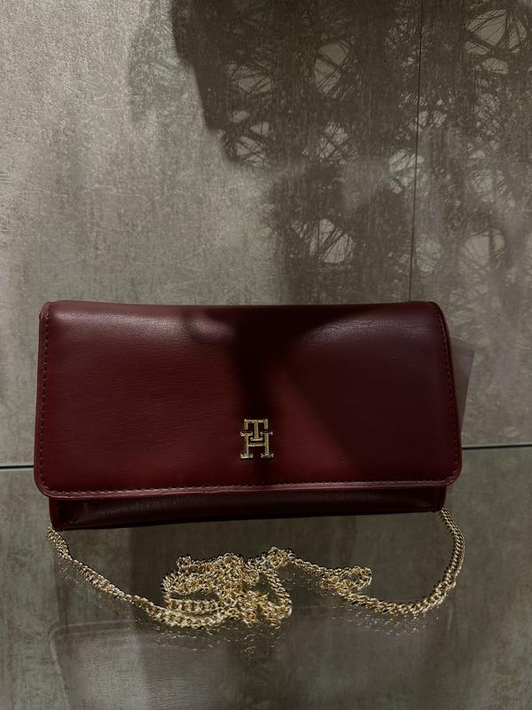 Компактная женская сумка бордового цвета с золотым логотипом и цепочкой. Изготовлена из качественного материала, стильный дизайн подходит для повседневного использования или выходов
