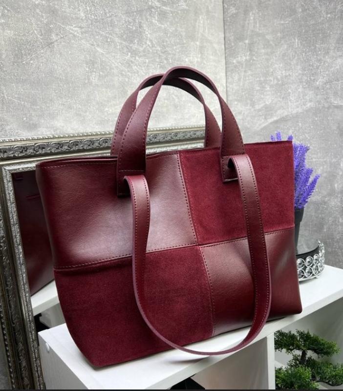 Эта большая женская сумка-шоппер из натуральной замши и эко-кожи станет идеальным аксессуаром для стильных и современных женщин. Доступная в двух привлекательных цветах — бордовом и зеленом, она подчеркнет ваш индивидуальный стиль и добавит нотку элегантности в повседневный образ. Размеры сумки делают её вместительной и удобной для различных ситуаций: ширина по дну — 32 см, ширина вверху — 42 см, высота — 30 см, глубина — 13 см. Внутреннее пространство сумки организовано так, чтобы вместить все необходимые вещи. Одно основное отделение на молнии делится на две части перегородкой на молнии, что позволяет удобно организовать ваши предметы. Внутри находятся открытая карман и карман на молнии для хранения мелочей. На задней стороне сумки также имеется карман на молнии для быстрого доступа к часто используемым предметам. Основные преимущества данной модели включают: Высококачественные материалы: Натуральная замша и эко-кожа, которые обеспечивают долговечность и износостойкость сумки. Функциональность: Одно основное отделение на молнии, разделенное перегородкой, открытый карман и карман на молнии внутри, а также карман на молнии снаружи. Элегантный дизайн: Два роскошных цвета — бордовый и зеленый, которые подчеркнут ваш стиль и элегантность. Удобство носки: Высокие ручки позволяют комфортно носить сумку на плече. Безопасность: Дополнительные карманы на молнии внутри и снаружи обеспечивают надежное хранение ваших вещей. Эта объемная женская сумка-шоппер станет незаменимым аксессуаром для тех, кто ищет стильную и функциональную сумку большого размера. Молодые женщины оценят её современный вид и практичность, а зрелые дамы — элегантность и удобство. Вы можете заказать эту сумочку в нашем интернет-магазине и дополнить свой гардероб стильным и функциональным аксессуаром.
