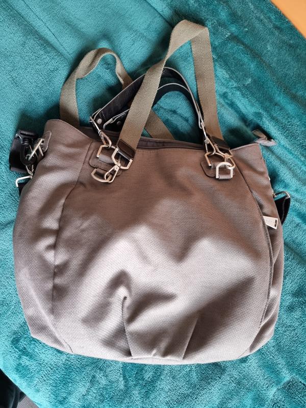 мегакрутая женская сумка, с дополнением (см.). фирменная. на всех металлах названия бренда. куча карманов внутри. застежка-молния. ручки отстегиваются. есть длинная ручка. снаружи тоже есть 2 кармана по бокам на молниях. замеры: 46×34, дно овальное 30×19. плотная ткань, по типу брезента. купленная в Германии. cтан новой