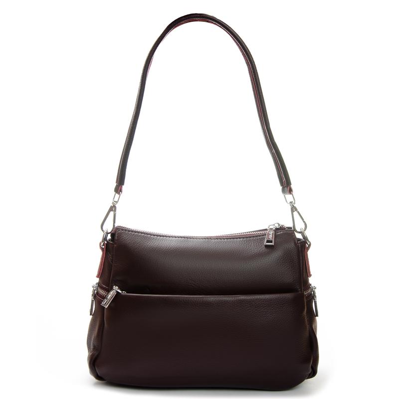 Выполнена из натуральной мягкой кожи. Закрывается на молнию. Внутри находится двойное отделение, разделенное карманом-перегородкой на молнии, боковой открытый карман и карман на молнии. Снаружи сумки на фасаде и на обороте расположены карманы на молнии. Дно сумки уплотненное. В комплекте регулируемый плечевой ремень и съемная ручка. Размер (см) 30*21*13, высота ручки 27см.