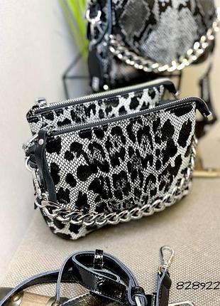 Четкая женская сумка Описание: Имеет три отдельных отделения Цвет: - черная змея - черный лео Размер: 23/16/10 Ремешок - длинный, регулируется Цепочка и короткий ремень есть в наличии Материал: натуральный замш и натуральная кожа (лаковая) Цена: 2099 грн.