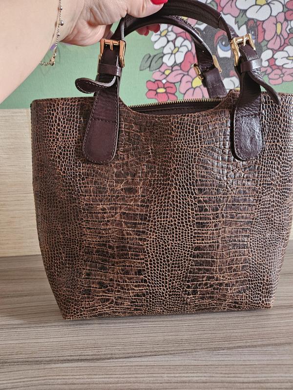 Женская сумка из натуральной кожи, фурнитурой с гальваническим покрытием. Внутреннее пространство сумки: два отделения, два кошенища: на молнии и накладная. Закрывается на фирменный замок. Есть длинная ручка, которая позволяет носить сумку на плече. В комплект также входит мешок для хранения. Модель: Black croco office Размер: 29×25×10 Плечевой ремень: 120 см Цвет фурнитуры: золото Материал верха: натуральная кожа Материалы подкладки: фирменная ткань Цвет: коричневый