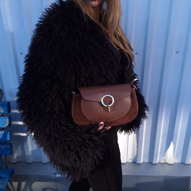 Элегантная женская сумка из кожи высокого качества. Особенности: • Материал: натуральная кожа и замша. • Цвет: насыщенный коричневый. • Стильный металлический декор в виде кольца с деталями. • Компактный размер, удобный для ежедневного использования. • Универсальная: подходит как для повседневных образов, так и для вечерних выходов. • Ремешок регулируется, можно носить на плече или через плечо. Состояние: новый. Дополнительная информация по запросу!