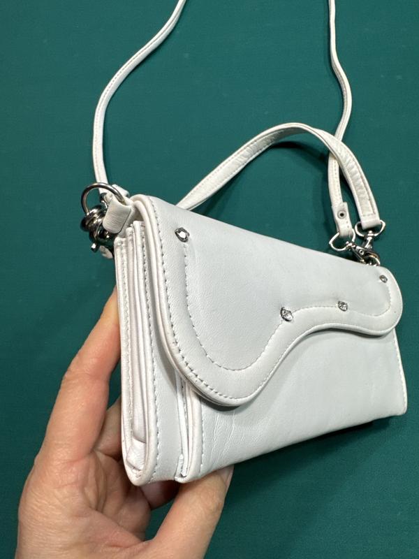 Біла вечірка сумочка Два ремінця на карабінах 113 см; 45 см Застібується на дві кнопки-магніти. Всередині 5 відділів, 2 з яких на блискавці. Розмір 23 см*12 см *3 см Перешлю