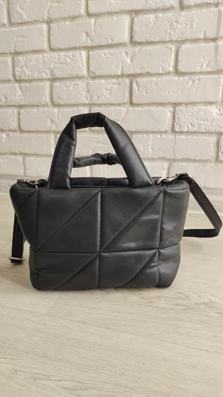 Стильная дутая стеганая сумка черного цвета с двумя ручками и ремешком на плечо. Удобная мягкая изготовлена из экокожи, закрывается на молнию. Ремешок регулируется по длине, можно носить через плечо. Внутри сумки подкладка. В хорошем состоянии но есть дефекты ручки потрескавшиеся и подкладка прорвана на последних фото показано. Замеры длина 31 см., ширина 10 см., высота сумки 20 см., высота маленьких ручек 12 см., и длинной ручки 55 см. в регулируется больше, меньше.