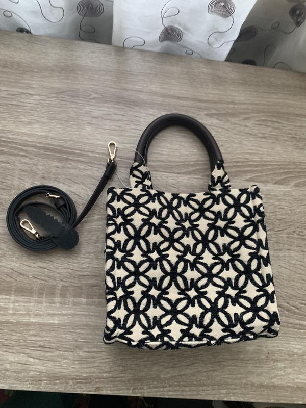 Сумочка из жаккардовой ткани с двумя короткими ручками сверху. Съемный регулируемый ремень через плечо и закрытая магнитная застежка. С подкладкой. Глубина/толщина 8 см. Высота 17 см. Ширина 20 см. Оболочка:Полиуретан 100% Внешний материал:Полиэстер 100% Подробности:Полиэстер 100% No продукта:1220308001 Весы:304 г Размер: Глубина: 8,0 см, Ширина: 20,0 см, Высота: 17,0 см Стиль аксессуаров:Сумка-мессенджер Описание:Бежевый/Черный, С рисунком